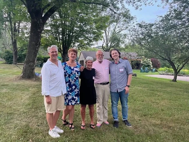 And that’s what it turned out to be—a blessing. The long tables we’d set out filled quickly with scrumptious summer salads, all manner of desserts and hors oeuvres, and bottles of wine and prosecco crowded the beer and seltzer we’d provided in ice-filled garden buckets. Neighbors in colorful summer clothes streamed into our still-green yard, donned their name tags, and quickly began to mingle, talking, laughing drinking, and eating until dark. Our son, who’s bought the property contiguous to us, came with his wife and one of his three sons to meet all who will soon become neighbors—a special thrill.